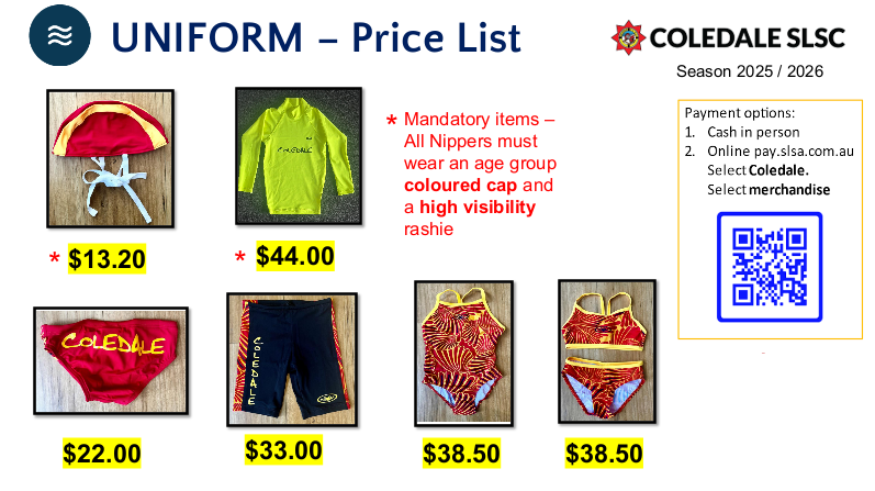 Uniform prices for 2025-26 season are below. Uniforms will be available from the proficiency session at Corrimal Pool on 29 September, and then at the first week of Nippers on 12 October.